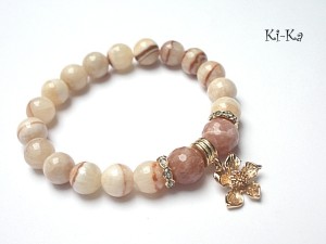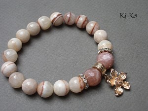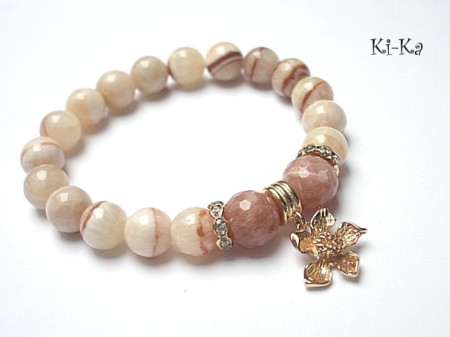 PROJEKT AUTORSKI. WŁASNOŚĆ KI-KA. KOPIOWANIE ZABRONIONE. Bransoletka wykonana z kul marmuru [10mm] , kamienia słonecznego [12mm] oraz elementów metalowych w kolorze różowego złota. Bransoletka na gumce silikonowej .Pasuje na nadgarstek 16-17cm.Biżuteria ozdobnie zapakowana