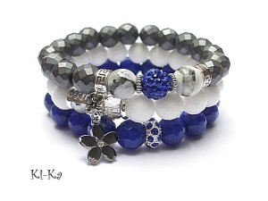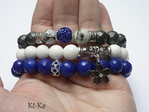 PROJEKT AUTORSKI. WSZELKIE INNE PODOBNE MODELE TO KOPIE NARUSZAJĄCE PRAWA AUTORSKIE .Komplet trzech bransoletek wykonanych z naturalnych kamieni - fasetowane jadeity [10mm], fasetowane matowe hematyty [10mm], kryształków [8mm] ,kuleczek kamienia księżycowego [10mm] , przekładki wysadzanej kryształkami ,kuleczki shamballa wysadzanej kryształkami Swarovskiego [10mm] oraz elementów metalowych w kolorze srebrnym. Pasują na nadgarstek 15,5-16,5cm . Biżuteria ozdobnie zapakowana.