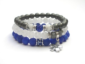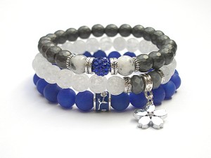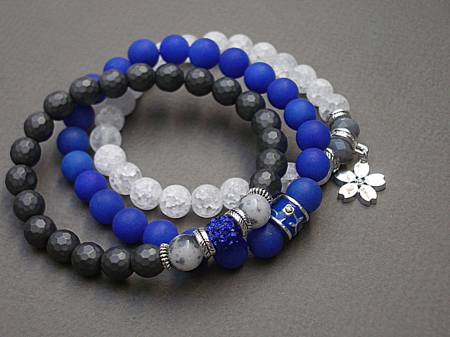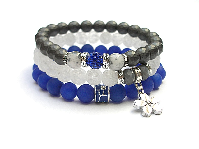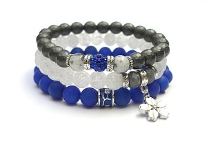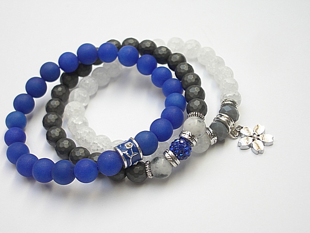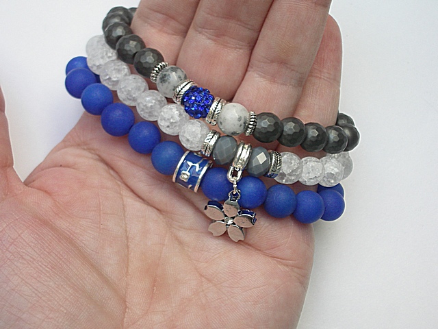 PROJEKTY AUTORSKIE. WŁASNOŚĆ KI-KA. WSZELKIE INNE PODOBNE MODELE TO KOPIE NARUSZAJĄCE PRAWA AUTORSKIE. Komplet trzech bransoletek wykonanych z naturalnych kamieni: jadeity matowe [8mm], jadeity [8mm], hematyt [8mm], kwarc lodowy [8mm], kryształków fasetowanych [6 x 8mm], przekładki shamballa wysadzanej kryształkami Swarovskiego oraz elementów metalowych w kolorze srebra. Bransoletki pasują na nadgarstek 16 - 17cm. Biżuteria ozdobnie zapakowana