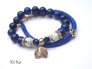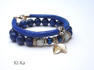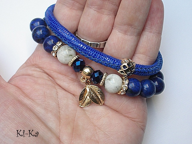 PROJEKT AUTORSKI. WŁASNOŚĆ KI-KA. KOPIOWANIE ZABRONIONE. Komplet dwóch bransoletek wykonany z naturalnych kamieni -marmur [10mm] , kamień księżycowy [10mm], kryształków fasetowanych [8mm], skórzanego rzemienia z mięciutkiej, koziej skórki [6mm] oraz elementów metalowych w kolorze tzw. różowego złota. Bransoletka z kamieni na gumce silikonowej. Pasują na nadgarstek 16-17cm. Biżuteria ozdobnie zapakowana. Możliwość dopasowania bransoletki do nadgarstka - wcześniej prosimy o kontakt.