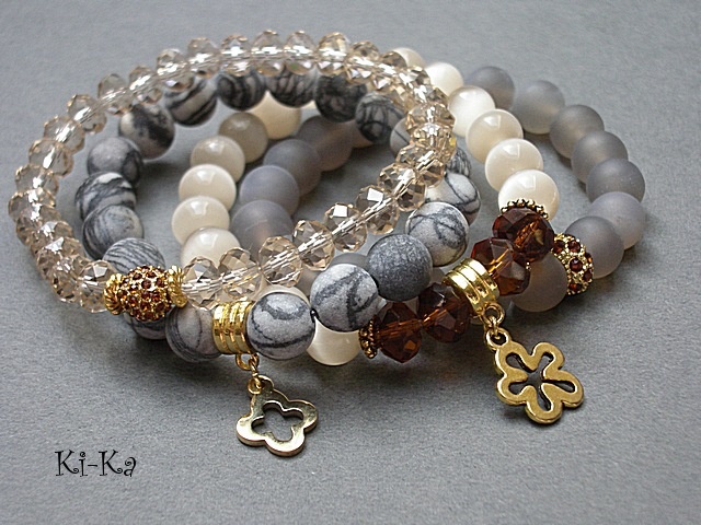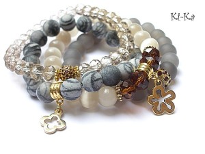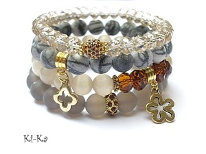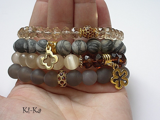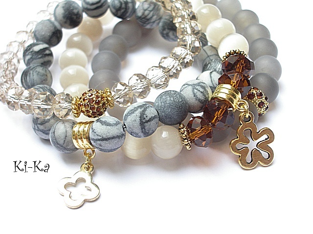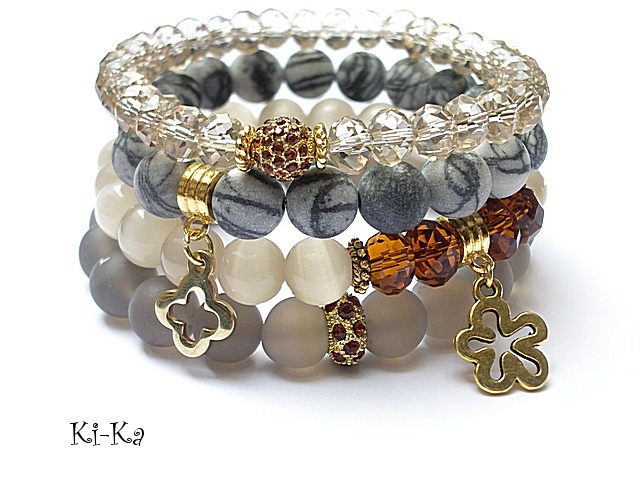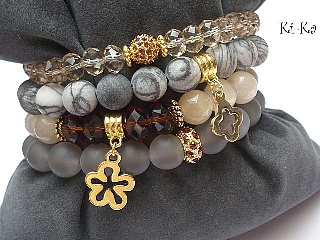 PROJEKT AUTORSKI. WSZELKIE INNE PODOBNE MODELE TO KOPIE NARUSZAJĄCE PRAWA AUTORSKIE. Komplet czterech bransoletek wykonanych z naturalnych kamieni: agaty matowe [10mm], jaspis matowy [10mm], uleksyt [10mm] krysztalków, ekskluzywnej przekładki wysadzanej cyrkoniami, przywieszki ze stali szlachetnej oraz elementów metalowych w kolorze złota. Bransoletki pasują na nadgarstek 15,5 - 16,5cm. Biżuteria ozdobnie zapakowana