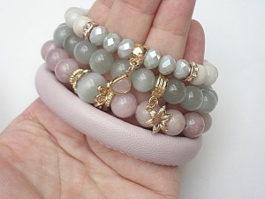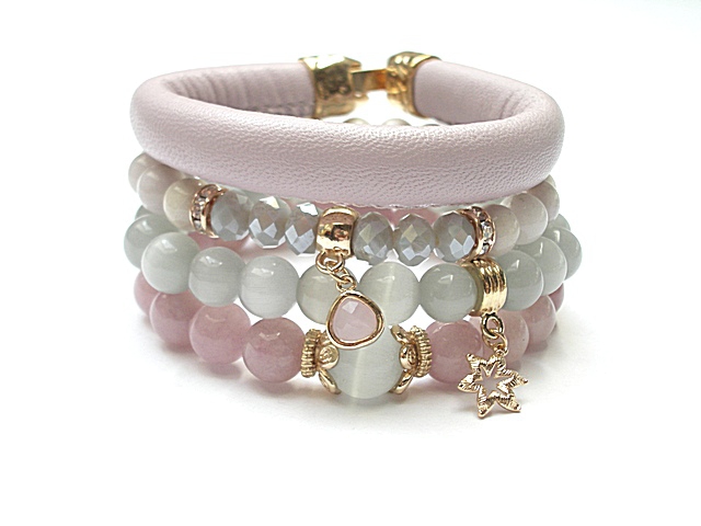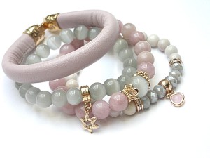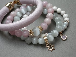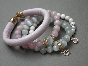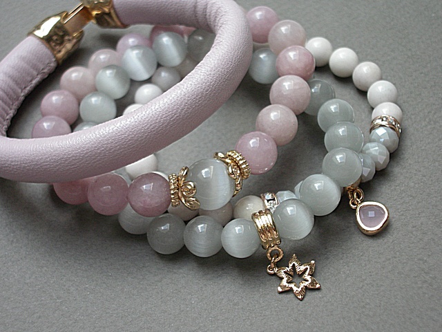 PROJEKT AUTORSKI. WŁASNOŚĆ KI-KA. KOPIOWANIE ZABRONIONE. Komplet czterech bransoletek wykonanych z rzemienia z naturalnej, grubej skórki cielęcej w kolorze pudrowego różu [10mm], kamieni: jadeity [10mm], uleksyt [10mm i 12mm], jaspis porcelanowy [8mm], kryształków fasetowanych [6 x 8mm], efektownej zawieszki ze szkła oraz elementów metalowych w kolorze tzw różowego złota. Bransoletki pasują na nadgarstek 16-17cm. Biżuteria ozdobnie zapakowana