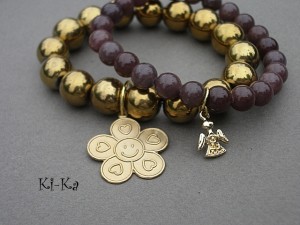 Komplet dwóch bransoletek wykonanych z naturalnych minerałów: awenturynu [8mm], dużych kul hematytu [12mm], dużej przywieszki w kształcie słoneczka z mosiądzu oraz elementów metalowych w złotym kolorze. Bransoletki pasują na nadgarstek 15 - 16,5cm. Biżuteria ozdobnie zapakowana.