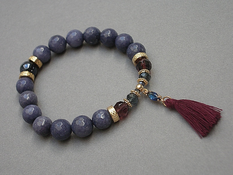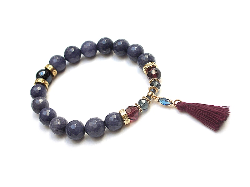 Bransoletka wykonana z kamieni naturalnych - fasetowane jadeity [10mm], szklana kuleczka [10mm], kryształki [8mm i 6mm], kuleczki fasetowanych szafirów [3mm], łącznik z cyrkonią, chwost oraz elementów metalowych w kolorze złotym. Bransoletka na gumce silikonowej. Pasuje na nadgarstek 16-17cm. Biżuteria ozdobnie zapakowana.