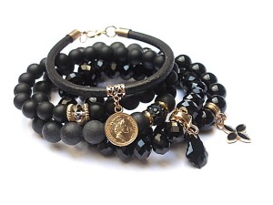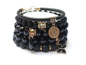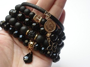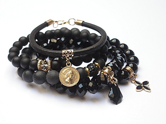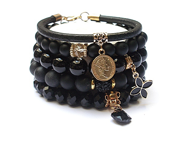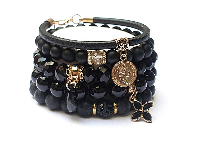 PROJEKT AUTORSKI. WSZELKIE INNE PODOBNE MODELE TO KOPIE NARUSZAJĄCE PRAWA AUTORSKIE. Komplet pięciu bransoletek wykonanych z naturalnych kamieni: black stone [8 i 10mm], onyks [10mm], krysztalków [8 x 10mm], rzemienia z naturalnej skóry, przekładki shamballa wysadzanej kryształkami Swarovskiego, przywieszki z kryształkiem Swarovskiego, oraz elementów metalowych w kolorze złota. Bransoletki pasują na nadgarstek 15,5 - 16,5cm. Biżuteria ozdobnie zapakowana wana