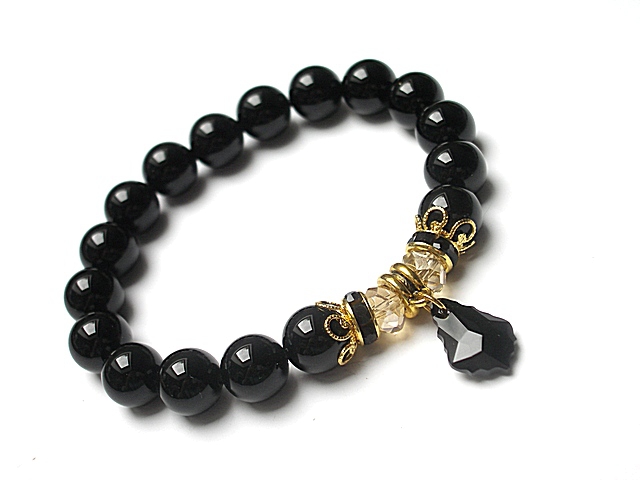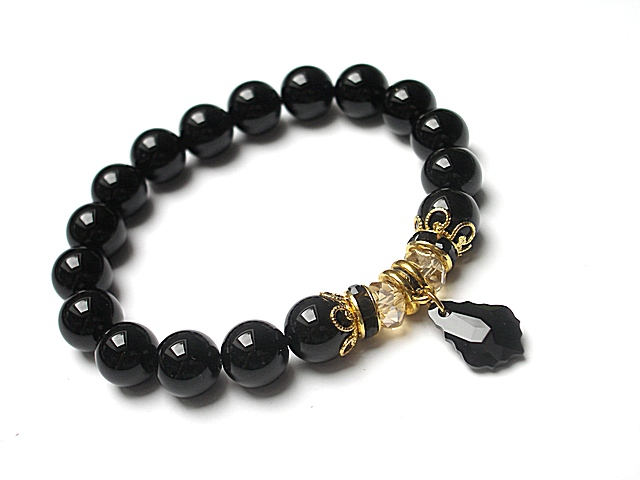 Bransoletka wykonana z naturalnych kamieni- onyks [10mm], kryształków [8mm], zawieszki z kryształka Swarovskiego oraz elementów metalowych w kolorze złota. Bransoletka na gumce silikonowej. Pasuje na nadgarstek 16-17cm. Biżuteria ozdobnie zapakowana. Możliwość dopasowania bransoletki do nadgarstka - wcześniej prosimy o kontakt.