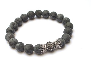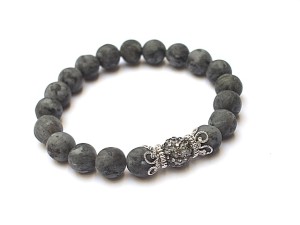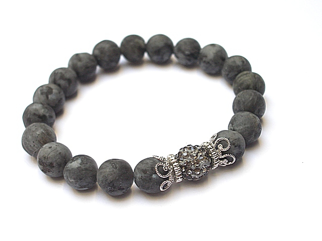 Bransoletka wykonana z naturalnych kamieni- matowy larvikit [10mm], przekładki shamballa wysadzanej kryształkami Swarovskiego oraz elementów metalowych w kolorze srebra. Bransoletka na gumce silikonowej. Pasuje na nadgarstek 16-17cm. Biżuteria ozdobnie zapakowana. Możliwość dopasowania bransoletki do nadgarstka - wcześniej prosimy o kontakt