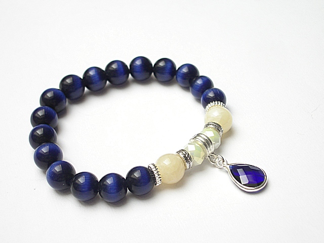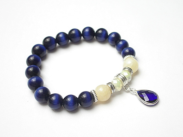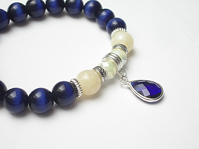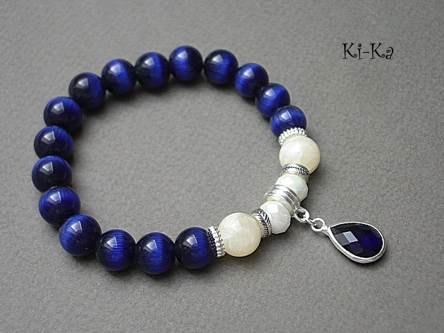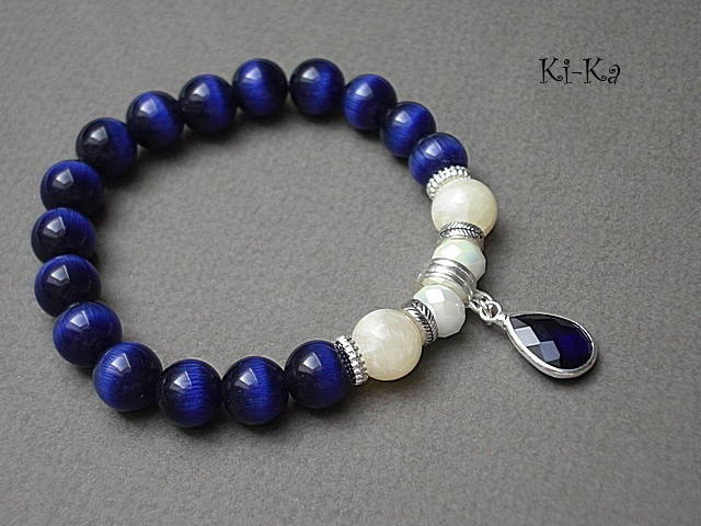 Bransoletka wykonana z kamieni - uleksyt [10mm], jadeity [10mm], kryształków fasetowanych [6 x 8mm], efektownej zawieszki ze szkła oraz elementów metalowych w kolorze srebra. Bransoletka na gumce silikonowej. Będzie pasowała na nadgarstek 16-17cm.cm. Biżuteria ozdobnie zapakowana
