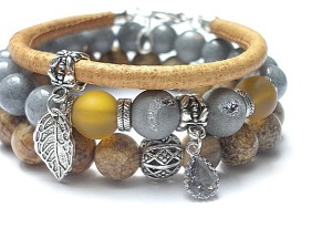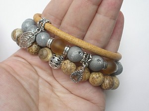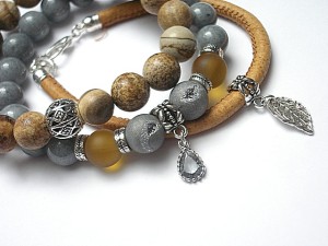 PROJEKT AUTORSKI. WŁASNOŚĆ KI-KA. KOPIOWANIE ZABRONIONE. Komplet trzech bransoletek wykonanych z naturalnych kamieni - jaspis krajobrazowy [10mm], marmur [10mm], agatów z naturalnymi druzami [10mm], matowego szkła [10mm], rzemienia z naturalnej, skóry cielęcej, efektownej, koronkowej zawieszki ze szkła oraz elementów metalowych w kolorze srebra. Bransoletki pasują na nadgarstek 16-17cm. Biżuteria ozdobnie zapakowana