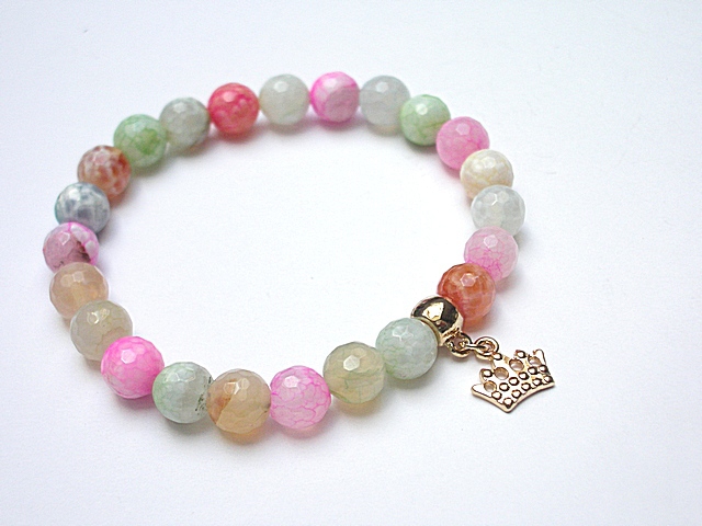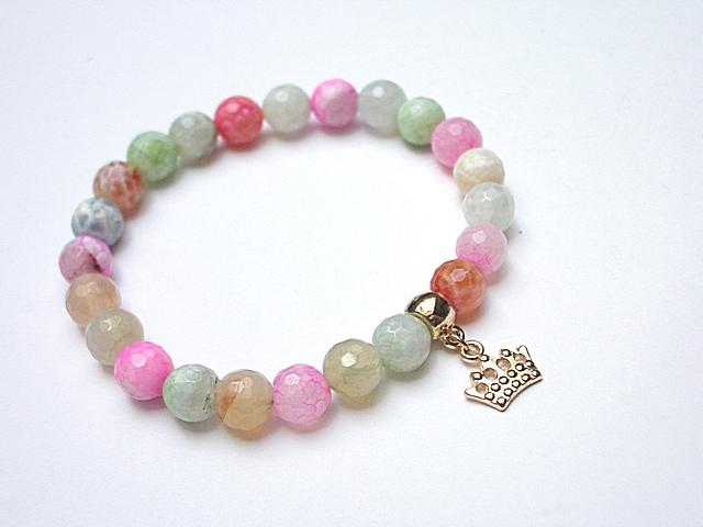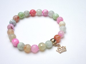 Bransoletka wykonana z kamieni naturalnych - fasetowane agaty w pastelowych kolorach [8mm] oraz elementów metalowych w kolorze złota. Bransoletka na gumce silikonowej. Pasuje na nadgarstek 16-17cm. Biżuteria ozdobnie zapakowana. Możliwość dopasowania bransoletki do nadgarstka - wcześniej prosimy o kontakt.