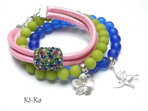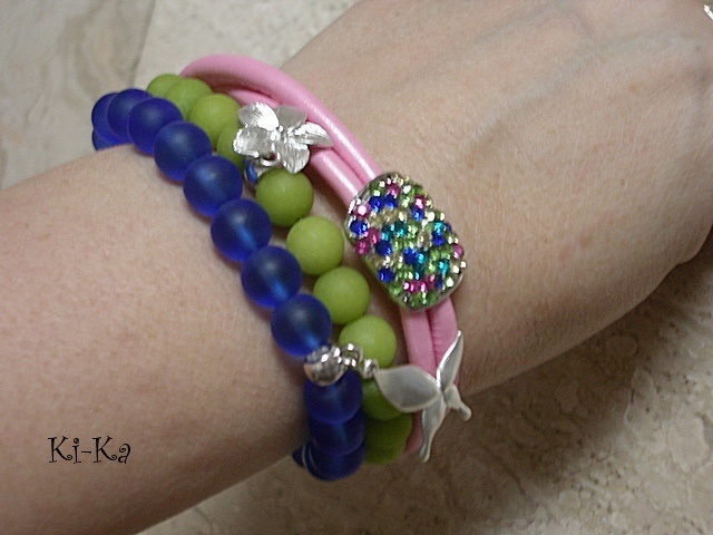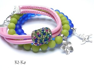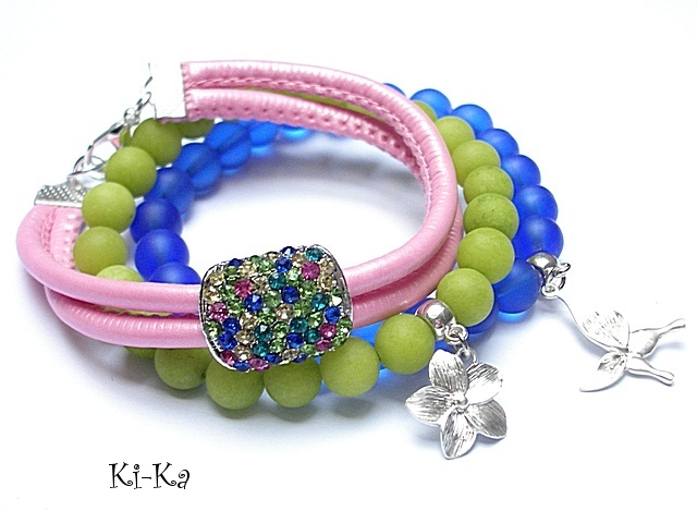 Komplet trzech bransoletek wykonanych z naturalnych kamieni [matowe jadeity 8mm] ,kryształków , rzemienia z ekologicznej, skóry, przekładki wysadzanej kryształkami oraz elementów metalowych w kolorze srebra. Bransoletki pasują na nadgarstek 15 - 16,5cm. Biżuteria ozdobnie zapakowana