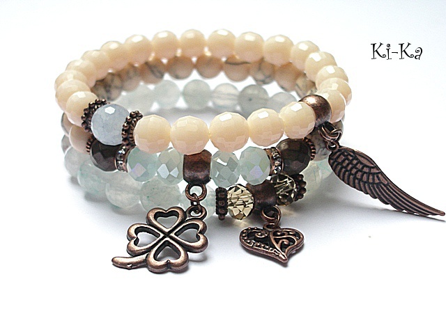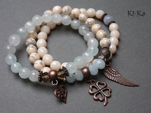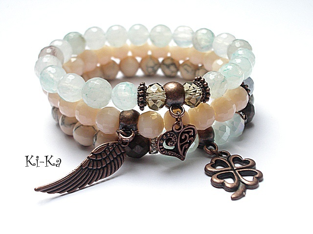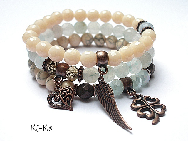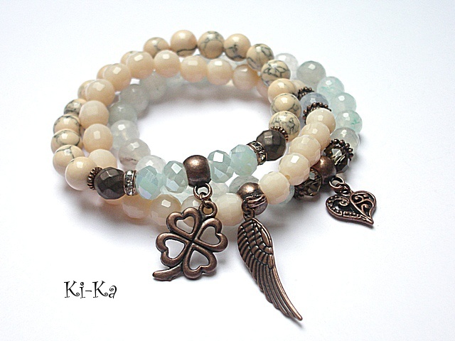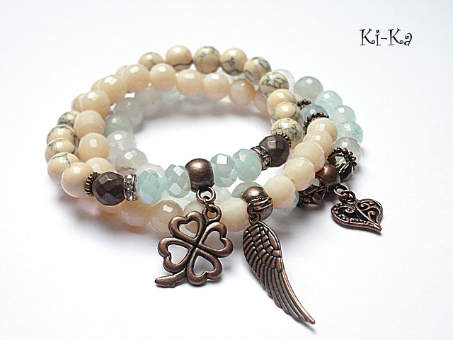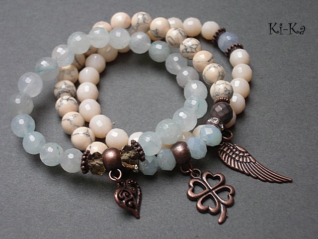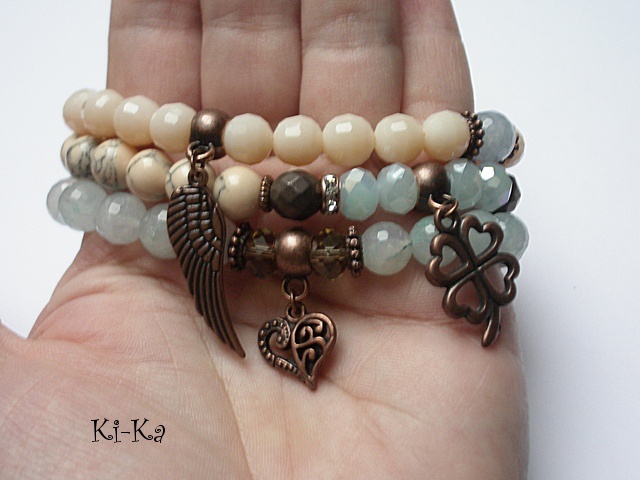 PROJEKT AUTORSKI. Komplet trzech bransoletek wykonanych z naturalnych kamieni: fasetowane kuleczki kwarców [8mm] ,howlity [8mm] ,matowe fasetowane hematyty [8mm] ,kryształki [8mm] oraz elementów metalowych w kolorze antycznej miedzi . Bransoletki pasują na nadgarstek 15-16,5cm [możliwość dopasowania ]. Biżuteria ozdobnie zapakowana.