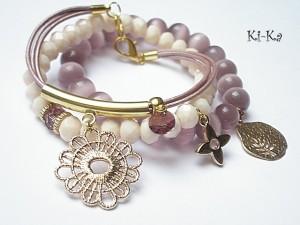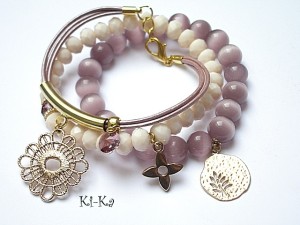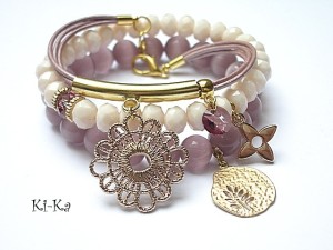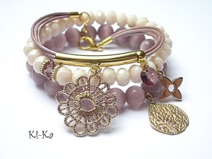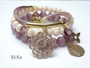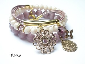 Komplet trzech bransoletek wykonany z kamieni naturalnych - uleksyt [10mm],fasetowane kryształki [8mm] , kryształek Swarovskiego [8mm] , rzemień perłowy z naturalnej skóry oraz elementów w kolorze złotym. Pasują na nadgarstek 15 -16,5cm. Bransoletki z kamieni na gumce silikonowej. Biżuteria ozdobnie zapakowana