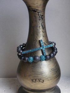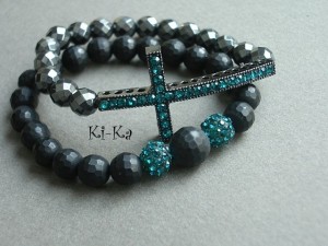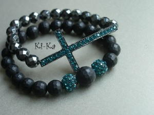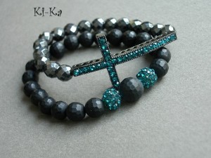 Komplet dwóch bransoletek wykonanych z kul fasetowanego hematytu [8mm], kul matowego onyksu [8mm] oraz z elementów metalowych - krzyż [50mm] i przekładki wysadzane kryształkami. Bransoletki na gumce silikonowej. Pasują na nadgarstek 15-17cm. Biżuteria ozdobnie zapakowana