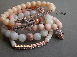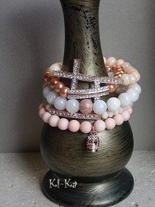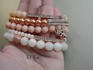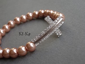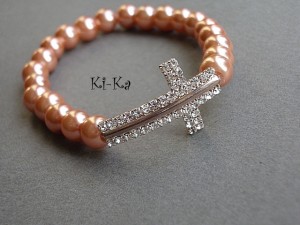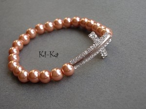 Bransoletka wykonana ze szklanych perełek w kolorze brzoskwiniowym [8mm] oraz krzyża wysadzanego kryształkami w kolorze różowego złota. Bransoletka na gumce silikonowej. Pasuje na nadgarstek 15,5-17cm. Biżuteria ozdobnie zapakowana. Bransoletki mogą stanowić komplet z innymi bransoletkami dostępnymi w naszej galerii - przykładowe zdjęcia