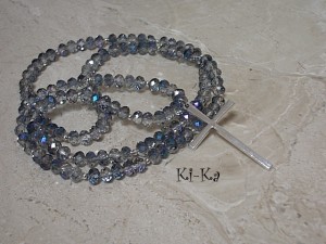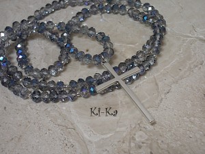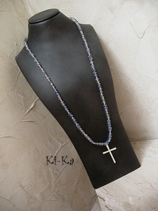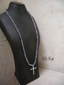 Długi naszyjnik wykonany z kryształków oraz krzyża w kolorze srebra. Całkowita długość naszyjnika: 94cm. Naszyjnik na gumce silikonowej. Biżuteria ozdobnie zapakowana.
