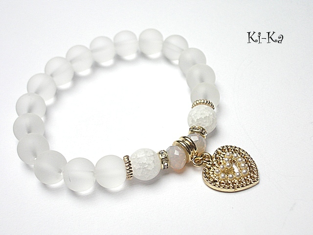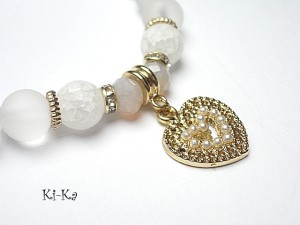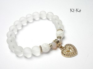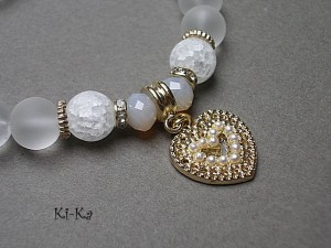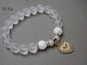 Bransoletka wykonana z naturalnych, minerałów -lodowy kwarc [10mm] ,szklane matowe kuleczki [10mm] ,kryształki [8mm] oraz elementów metalowych w kolorze jasnego złota. Bransoletka na gumce silikonowej. Pasuje na nadgarstek 16-17 Biżuteria ozdobnie zapakowana. Możliwość dopasowania do nadgarstka - wcześniej prosimy o kontakt