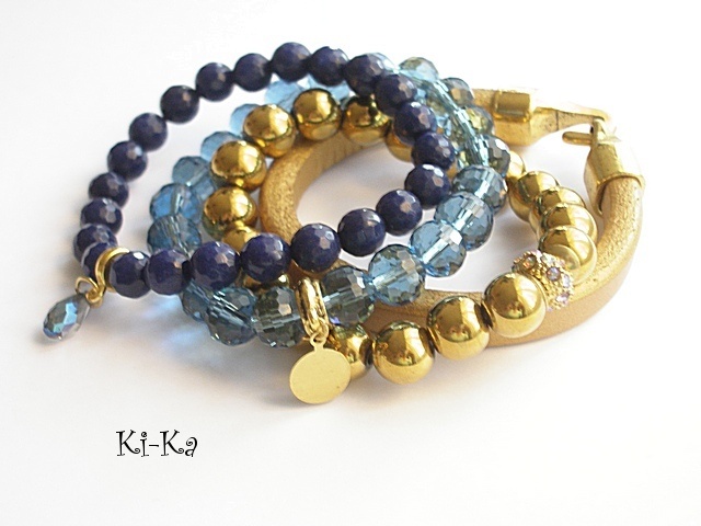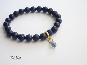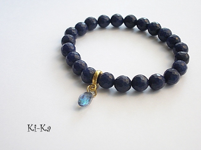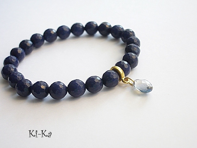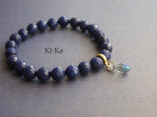 Bransoletka wykonana z naturalnych, kamieni - fasetowane jadeity [8mm], kryształka w kształcie briolety z poświatą AB oraz elementów w kolorze złota Bransoletka na gumce silikonowej. Pasuje na nadgarstek 15-16,5cm. Biżuteria ozdobnie zapakowana. Bransoletka może stanowić komplet z innymi modelami - przykładowe zdjęcia.