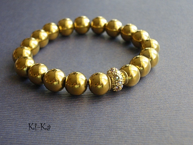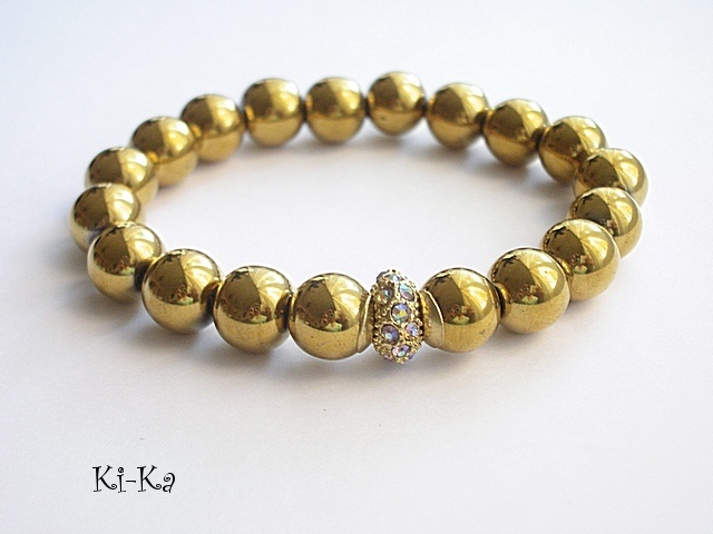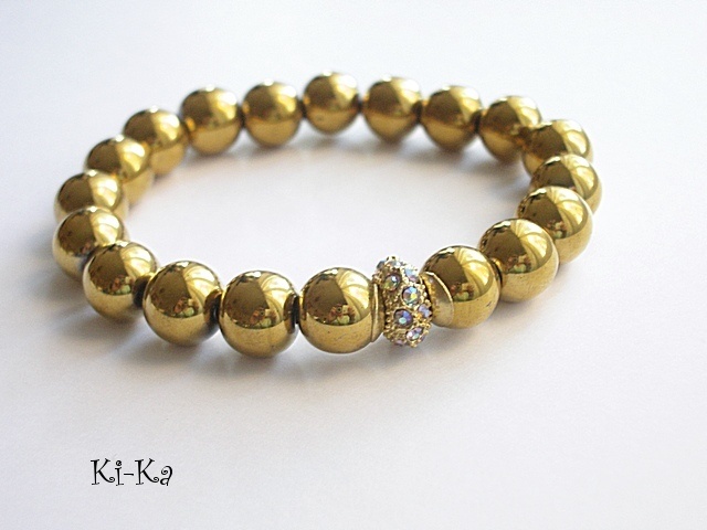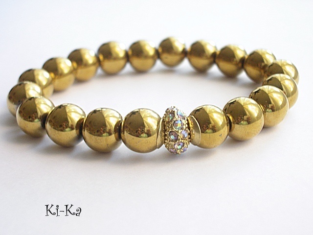 Bransoletka wykonana z naturalnych, kamieni - hematyt [10mm] oraz elementów w kolorze złota [przekładka wysadzana kryształkami] Bransoletka na gumce silikonowej. Pasuje na nadgarstek 15-16,5cm. Biżuteria ozdobnie zapakowana. Bransoletka może stanowić komplet z innymi modelami - przykładowe zdjęcia