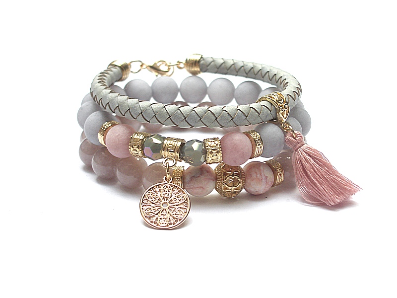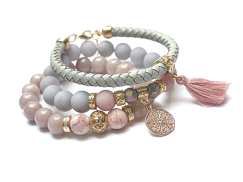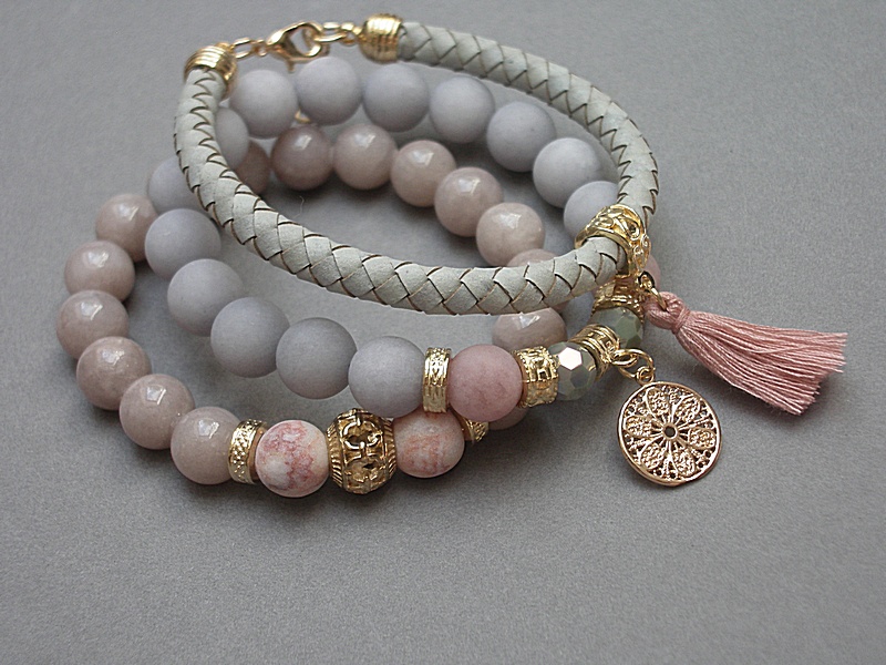 Komplet trzech bransoletek wykonanych z naturalnych kamieni - jadeity [10mm], matowe jadeity [10mm], matowe jaspisy [10mm], kryształki [8mm], chwostu, rzemienia z naturalnej skóry plecionej oraz elementów metalowych w kolorze złota. Bransoletki pasują na nadgarstek 15,5-16,5cm. Biżuteria ozdobnie zapakowana.