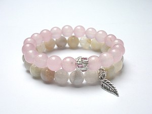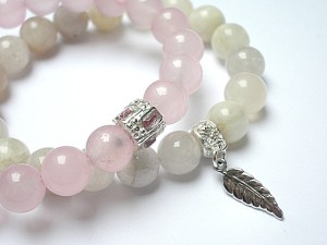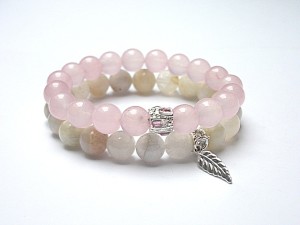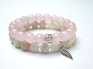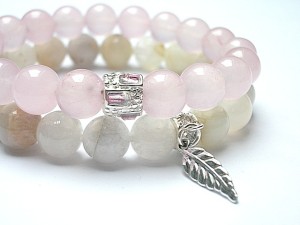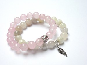 Komplet dwóch bransoletek wykonanych z naturalnych minerałów: jadeity [10mm], kamień księżycowy [10mm], przekładki wysadzanej kryształkami oraz elementów w kolorze srebra. Bransoletki na gumce silikonowej. Bransoletki będą pasowały na nadgarstek 15,5-16,5cm