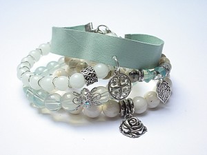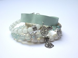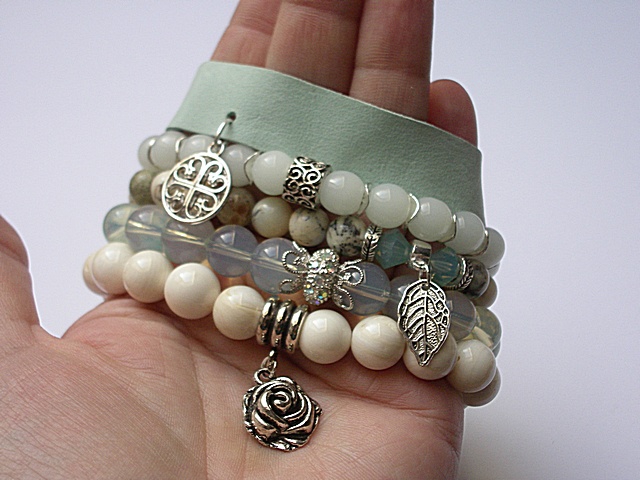 PROJEKT AUTORSKI. WSZELKIE INNE PODOBNE MODELE TO KOPIE NARUSZAJĄCE PRAWA AUTORSKIE .Komplet pięciu bransoletek wykonanych z naturalnych kamieni - opal [8mm], jadeity [8mm], muszli [10mm], szkła [10mm], kryształków Swarovskiego [bicone 8mm], rzemienia z naturalnej skóry [szer. 15mm] oraz elementów metalowych w kolorze srebra. Pasują na nadgarstek 16-17cm . Biżuteria ozdobnie zapakowana.