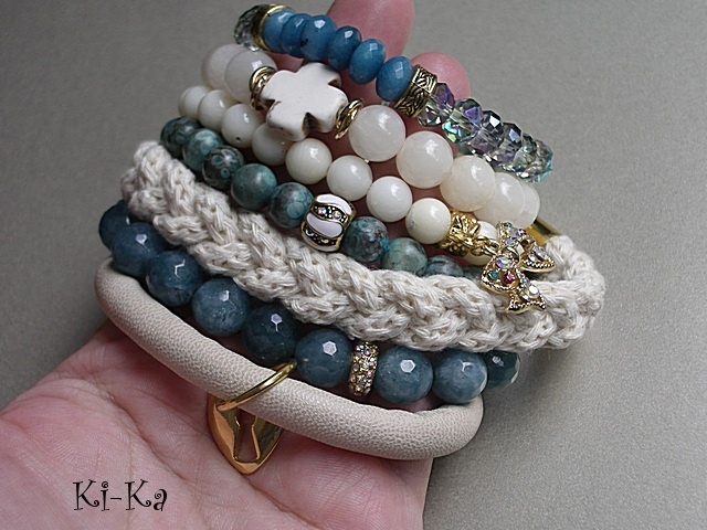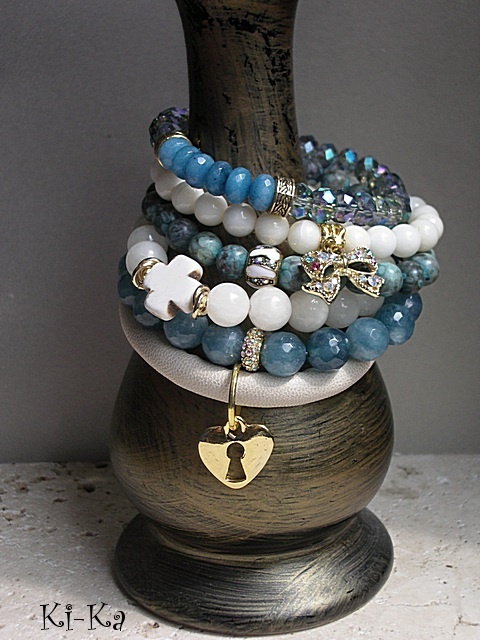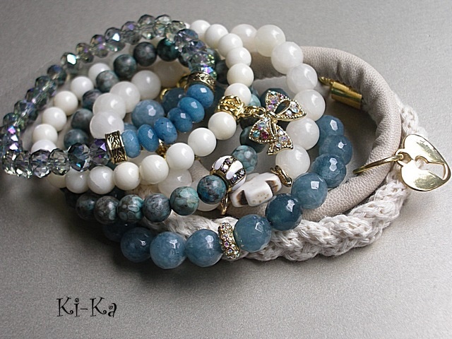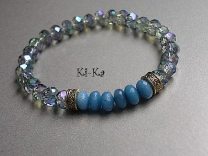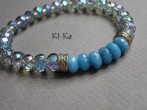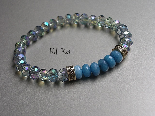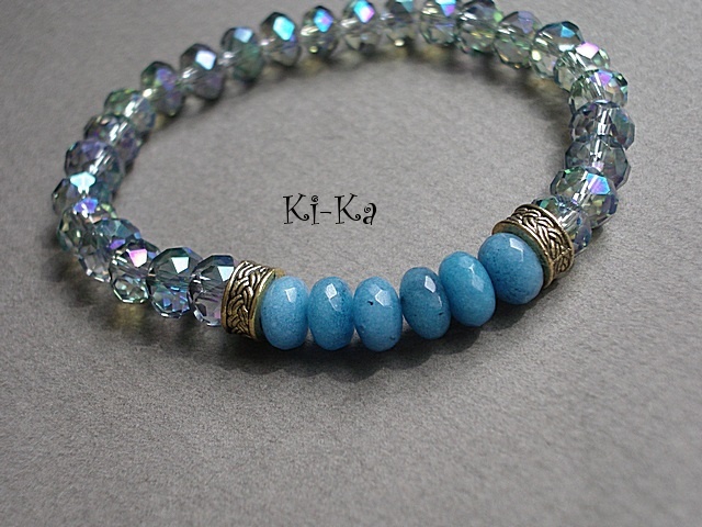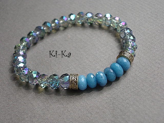 Bransoletka wykonana z fasetowanych szklanych oponek [8mm] oraz oponek naturalnych minerałów [jadeity] . Pasuje na nadgarstek 15,5 -16,5cm . Bransoletka na gumce silikonowej. Biżuteria ozdobnie zapakowana. Bransoletka może stanowić komplet z innymi bransoletkami dostępnymi w naszej galerii - przykładowe zdjęcia.
