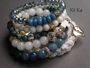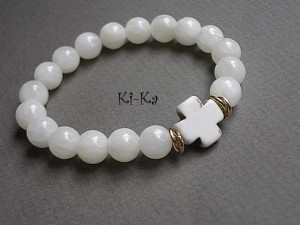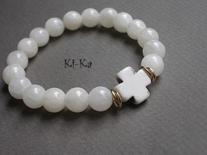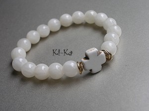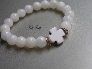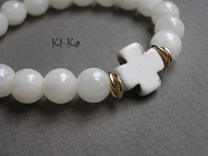 Bransoletka wykonana z naturalnych minerałów - jadeit [10mm] oraz krzyż z howlitu. Pasuje na nadgarstek 15,5- 16,5cm. Bransoletka na gumce silikonowej. Biżuteria ozdobnie zapakowana. Bransoletka może stanowić komplet z innymi - przykładowe zdjęcia.