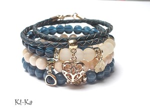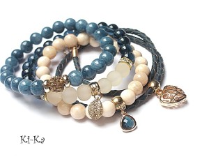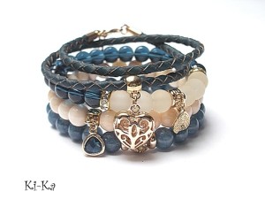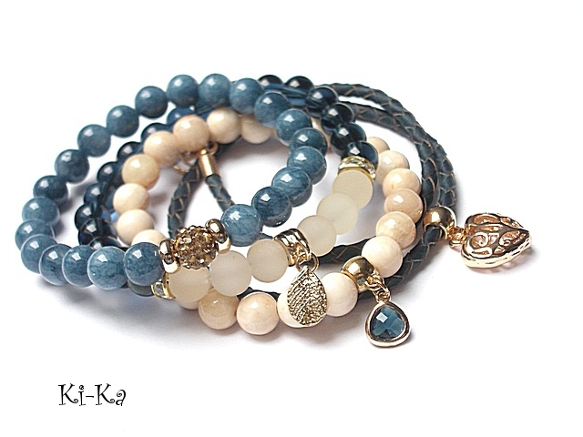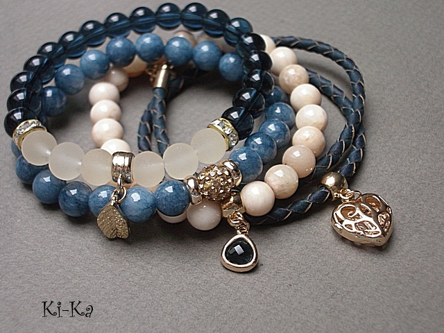 PROJEKT AUTORSKI. WŁASNOŚĆ KI-KA. KOPIOWANIE ZABRONIONE Komplet trzech bransoletek wykonanych z naturalnych kamieni: marmur [8mm], szklanych koralików [8mm], matowego szkła [8mm], rzemienia z naturalnej, plecionej skóry w kolorze denim, przekładki shamballa wysadzanej kryształkami Swarovskiego, przywieszki szklanej w oprawie oraz elementów metalowych w kolorze tzw. różowego złota. Bransoletki pasują na nadgarstek 15,5 - 16,5cm. Biżuteria ozdobnie zapakowana