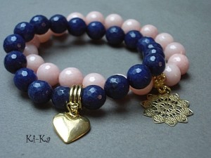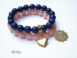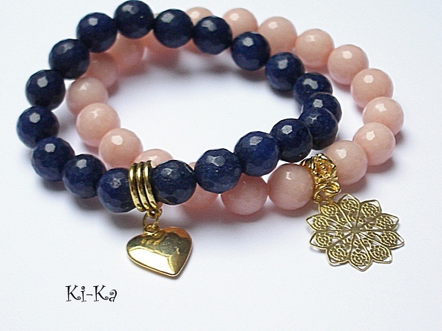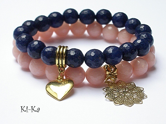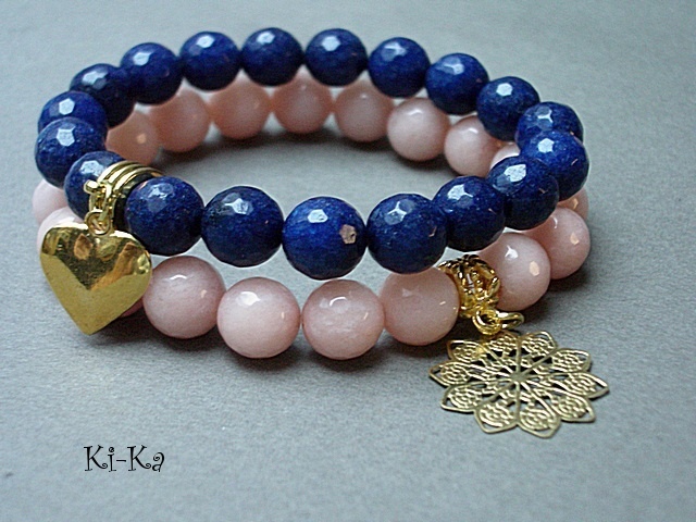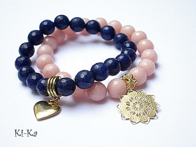 Komplet dwóch bransoletek wykonany z naturalnych kamieni - jadeity fasetowane [10mm] oraz elementów w kolorze złotym Pasuje na nadgarstek 15 -16,5cm. Bransoletki na gumce silikonowej. Biżuteria ozdobnie zapakowana.