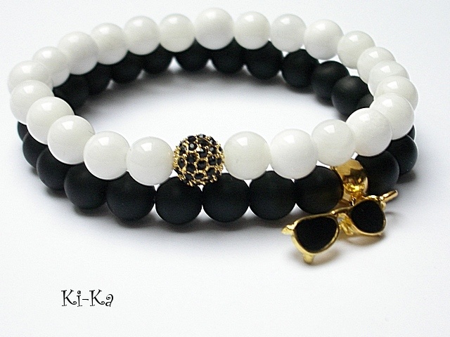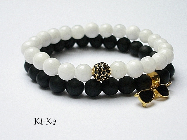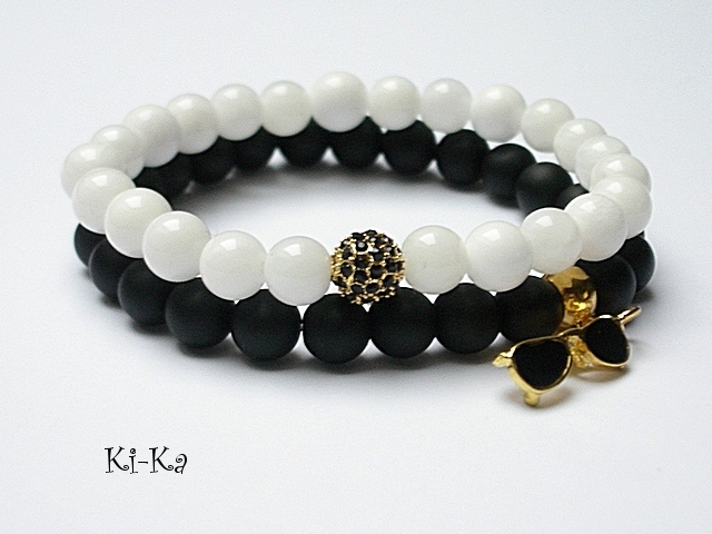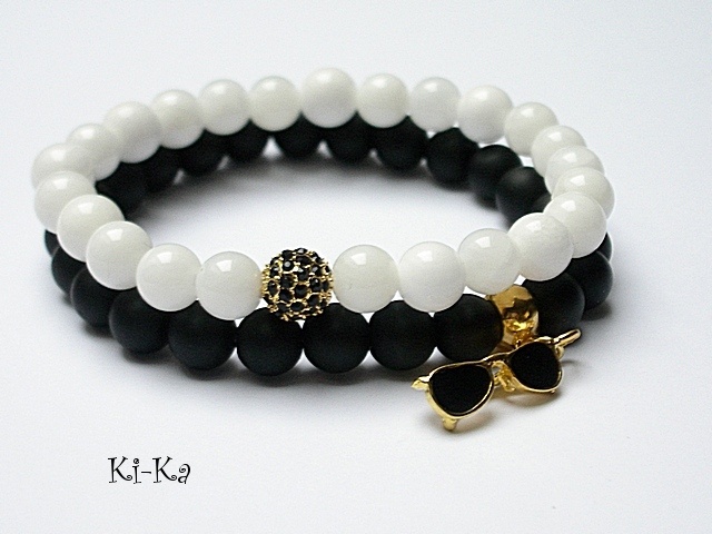 Komplet dwóch bransoletek wykonany z naturalnych kamieni - agatów i black stone [8mm], przekładki wysadzanej cyrkoniami oraz elementów w kolorze złotym Pasuje na nadgarstek 15 -16,5cm. Bransoletki na gumce silikonowej. Biżuteria ozdobnie zapakowana.
