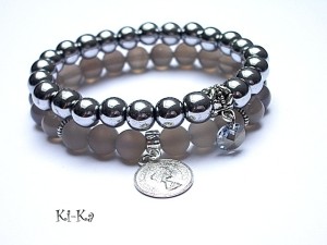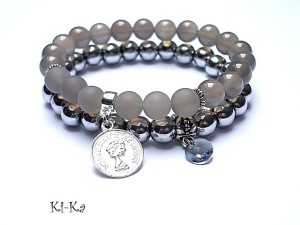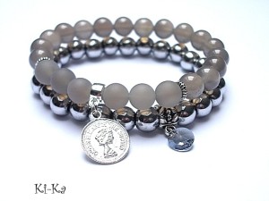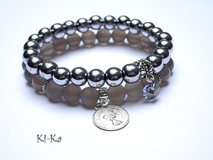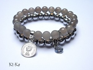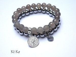 Komplet dwóch bransoletek wykonanych z naturalnych kamieni: hematyty [8mm], agaty [8mm], kryształka Swarovskiego [8mm] oraz elementów metalowych w kolorze srebrnym. Bransoletki pasują na nadgarstek 15,5-16,5cm. Biżuteria ozdobnie zapakowana.