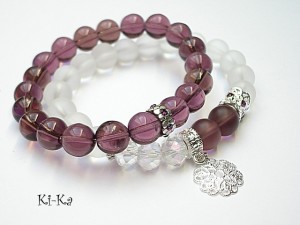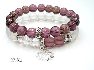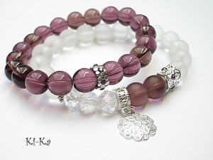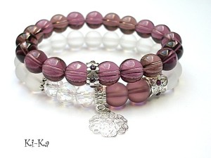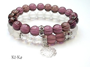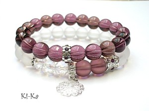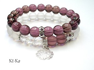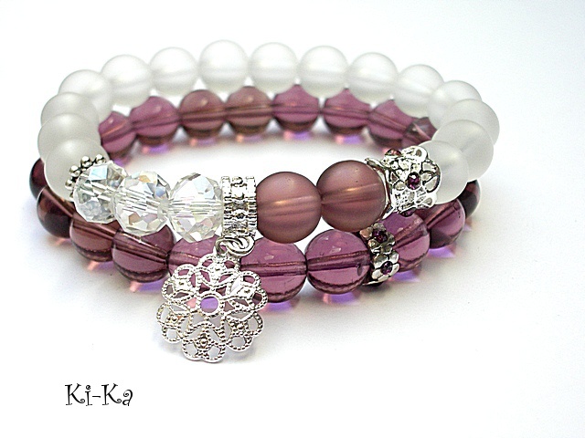 Komplet dwóch bransoletek wykonanych ze szkła [10mm], kryształków [8 x 10mm], przekładek wysadzanych cyrkoniami oraz elementów metalowych w srebrnym kolorze. Bransoletki pasują na nadgarstek 15-16,5cm. Biżuteria ozdobnie zapakowana.