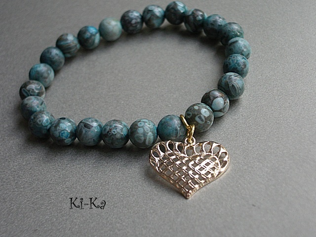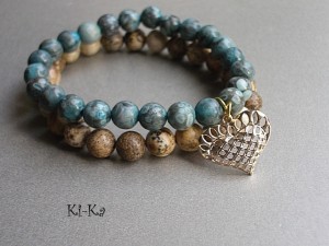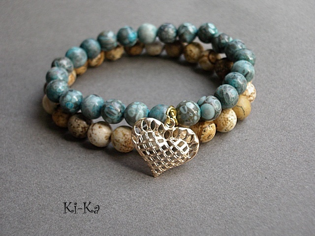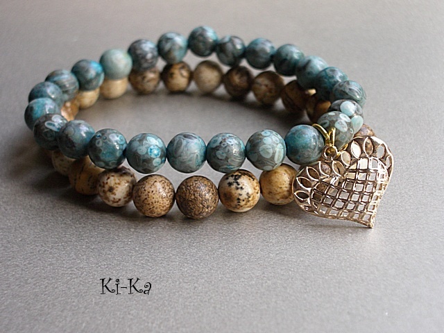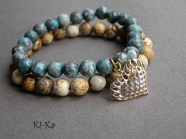 Komplet dwóch bransoletek wykonanych z naturalnych kamieni: jaspis oceaniczny i jaspis krajobrazowy [8mm] oraz elementów metalowych w złotym kolorze. Bransoletki pasują na nadgarstek 15 - 16,5cm. Biżuteria ozdobnie zapakowana. Możliwość dopasowania bransoletek do nadgarstka - wcześniej prosimy o kontakt.