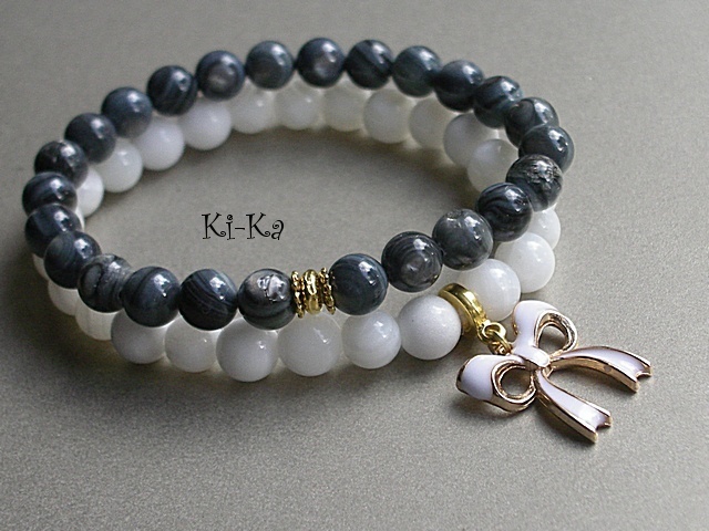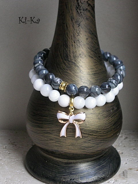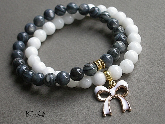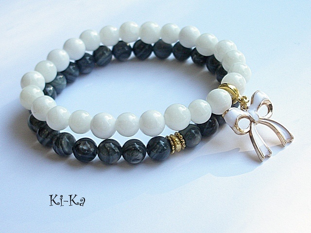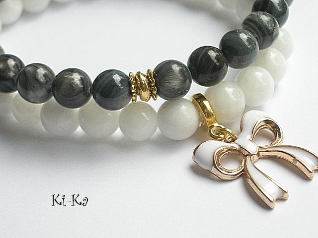 Komplet dwóch bransoletek wykonanych z muszli [8mm] oraz elementów w kolorze złota Bransoletki pasują na nadgarstek 15 - 16,5cm. Biżuteria ozdobnie zapakowana. Możliwość dopasowania bransoletek do nadgarstka - wcześniej prosimy o kontakt.