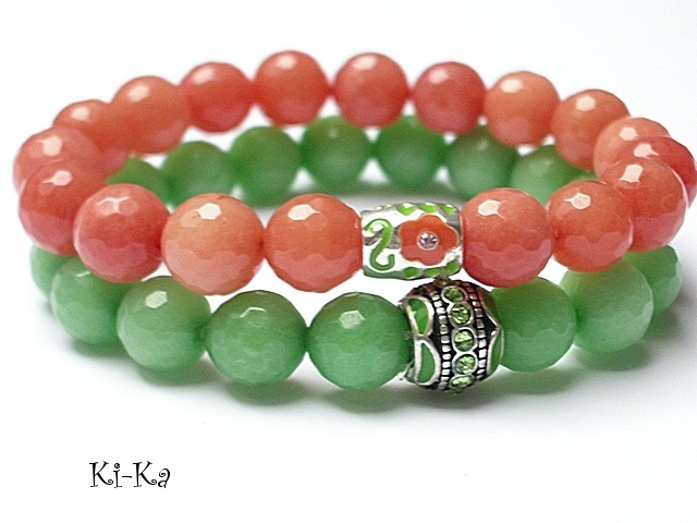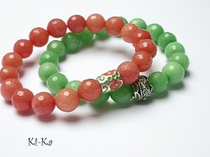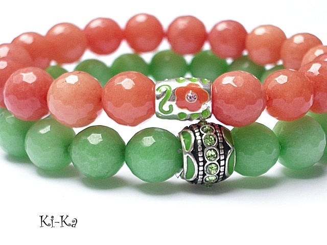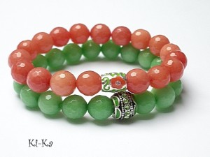 Komplet dwóch bransoletek wykonany z naturalnych kamieni - jadeitów [10mm] oraz elementów w kolorze srebrnym. Pasuje na nadgarstek 15 -16,5cm. Bransoletka na gumce silikonowej. Biżuteria ozdobnie zapakowana.
