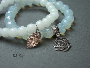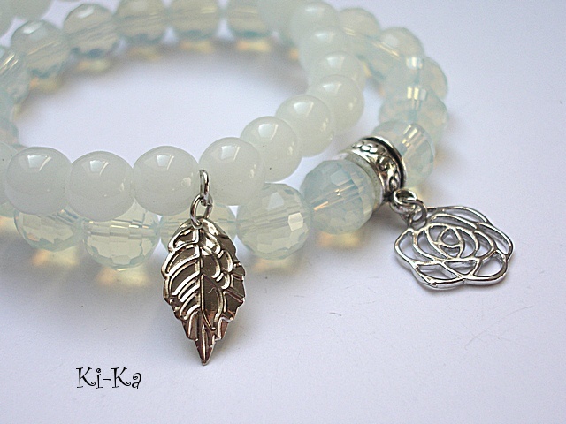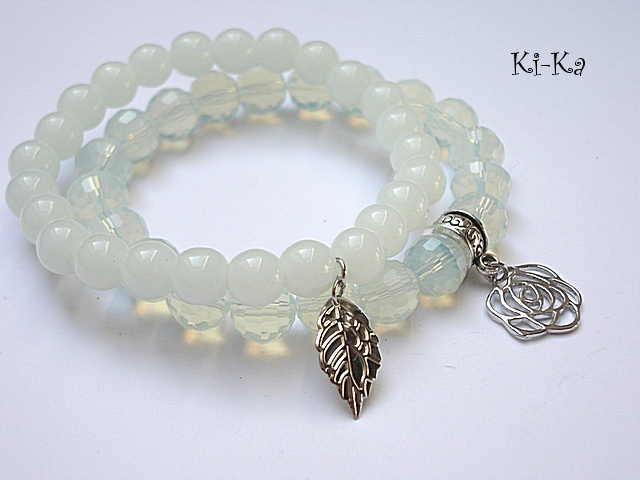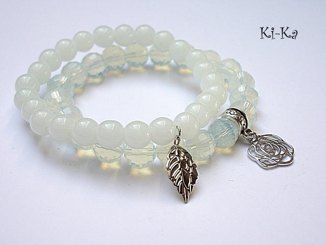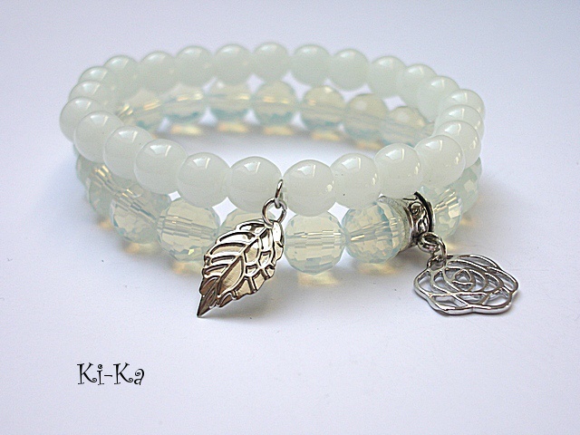 Komplet dwóch bransoletek wykonanych z naturalnych kamieni - jadeity [8mm], kryształków [10mm] oraz elementów metalowych w kolorze srebra. Bransoletki na gumce silikonowej. Pasują na nadgarstek 15,5 - 16,5cm. Biżuteria ozdobnie zapakowana. Możliwość dopasowania bransoletek do nadgarstka - wcześniej prosimy o kontakt