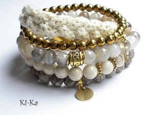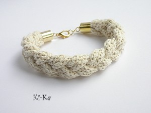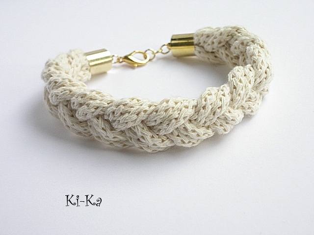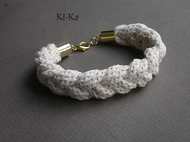 Bransoletka wykonana z bawełnianych sznurków zaplecionych w warkocz oraz elementów w kolorze złota. Pasuje na nadgarstek 15,5-16,5cm. Biżuteria ozdobnie zapakowana. Zdjęcie pierwsze przedstawia przykładowy set - cena dotyczy bransoletki ze sznurka