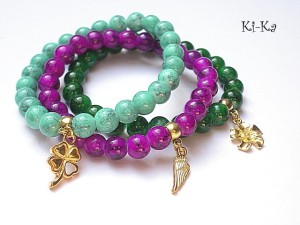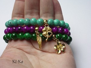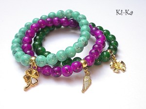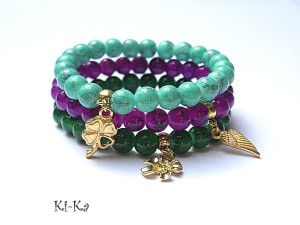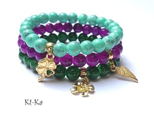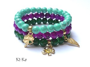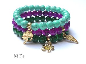 Komplet trzech bransoletek wykonanych ze szkła [8mm] oraz elementów metalowych w kolorze złotym. Bransoletki pasują na nadgarstek 15,5 - 16,5cm. Biżuteria ozdobnie zapakowana.
