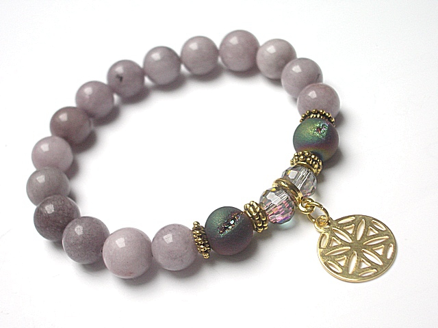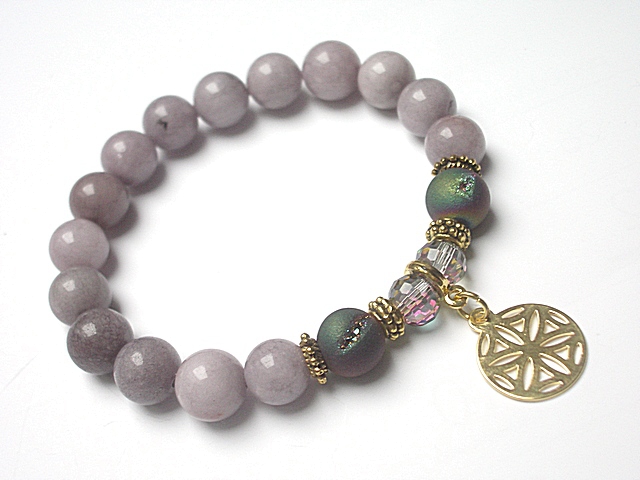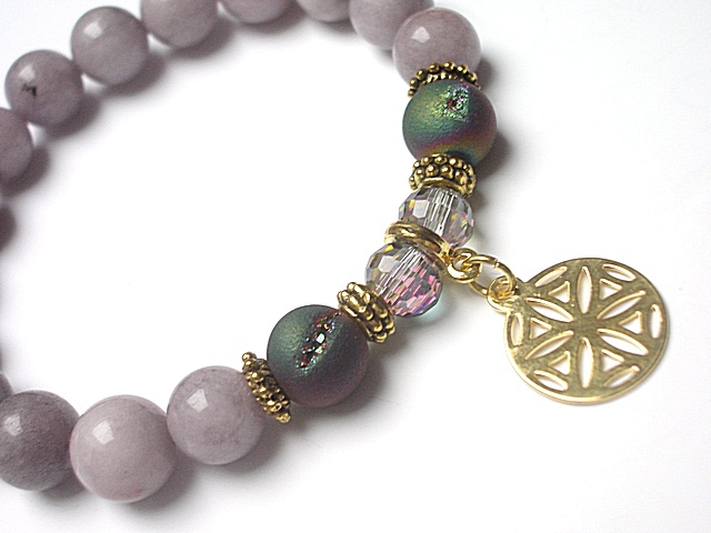 PROJEKT AUTORSKI. WŁASNOŚĆ KI-KA. KOPIOWANIE ZABRONIONE. Bransoletka wykonana z naturalnych kamieni - jadeity [10mm], druzy agatów z efektownymi pęknięciami pokryte tytanem [10mm], kryształków fasetowanych [8mm], zawieszki z platerowanego mosiądzu oraz elementów metalowych w kolorze złota. Bransoletka na gumce silikonowej. Pasuje na nadgarstek 16-17cm. Biżuteria ozdobnie zapakowana. Możliwość dopasowania bransoletki do nadgarstka - wcześniej prosimy o kontakt.