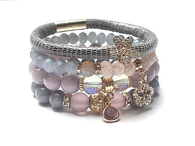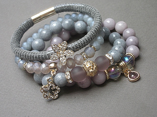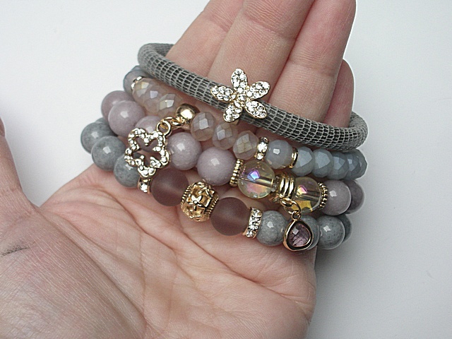 Komplet czterech bransoletek wykonanych z jadeitów [10mm], matowych szklanych kuleczek [10mm], szklanych opalizujących kuleczek [10mm], kryształków [8mm], zawieszki w okuciu, rzemienia z naturalnej skórki [śr. 7mm], przekładki i zawieszki wysadzanej cyrkoniami oraz elementów metalowych w kolorze złota. Bransoletki z kamieni i kryształków na gumce silikonowej. Pasują na nadgarstek 15,5-16,5cm. Biżuteria ozdobnie zapakowana.