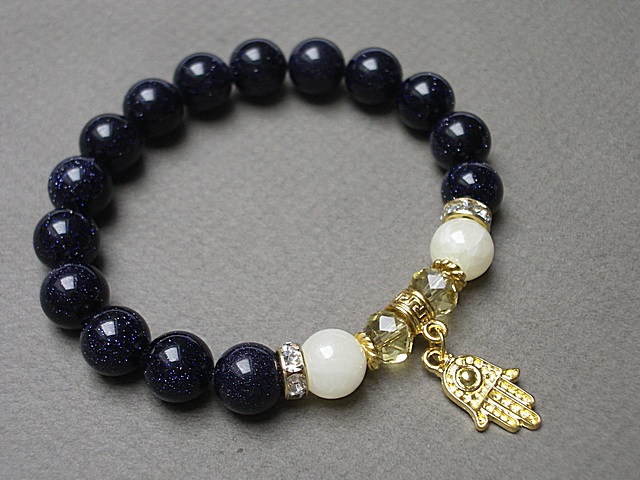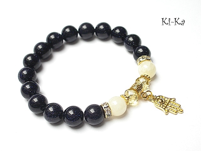 Bransoletka wykonana z kuleczek nocy kairu [10mm] ,jadeitów [10mm ] .kryształków [8mm] oraz elementów metalowych w kolorze złota. Bransoletka na gumce silikonowej. Pasuje na nadgarstek 16-17cm. Biżuteria ozdobnie zapakowana. Możliwość dopasowania bransoletki do nadgarstka - wcześniej prosimy o kontakt.