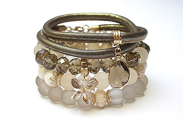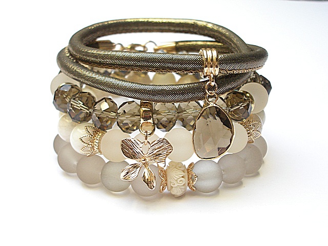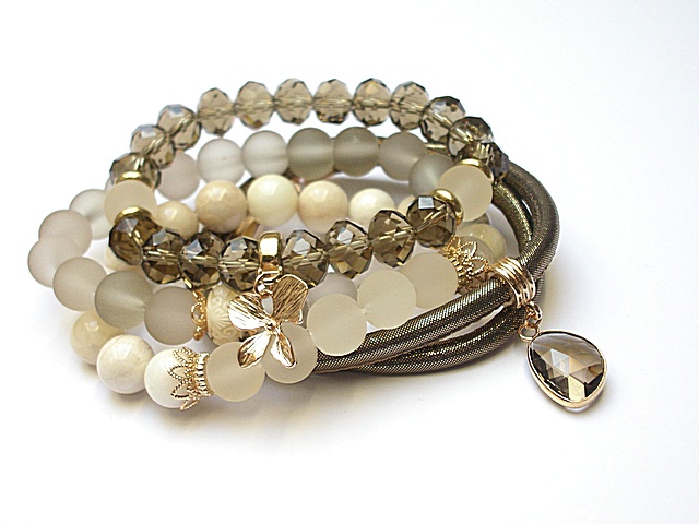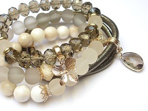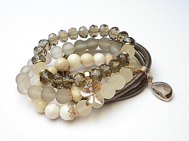 PROJEKT AUTORSKI. WSZELKIE INNE PODOBNE MODELE TO KOPIE NARUSZAJĄCE PRAWA AUTORSKIE. Komplet czterech bransoletek wykonanych z naturalnych kamieni: kamień księżycowy [10mm], szkła matowego [10mm], kryształków fasetowanych [10 x 8mm], przekładki z rzeźbionego korala, rzemienia z ekologicznego rzemienia, platerowanych przywieszek oraz elementów metalowych w kolorze tzw. różowego złota. Bransoletki pasują na nadgarstek 15,5 - 16,5cm. Biżuteria ozdobnie zapakowana