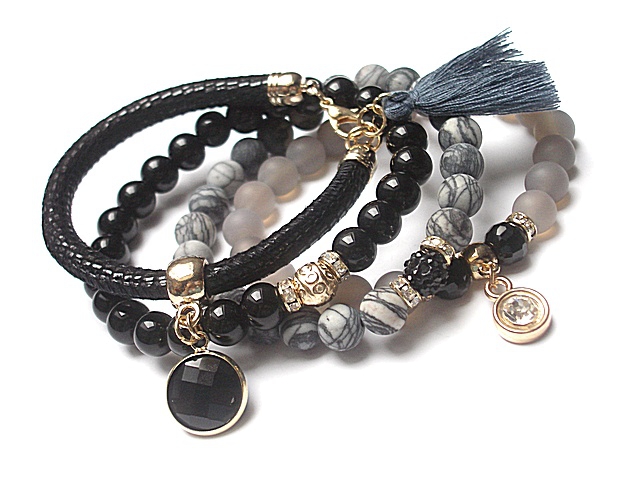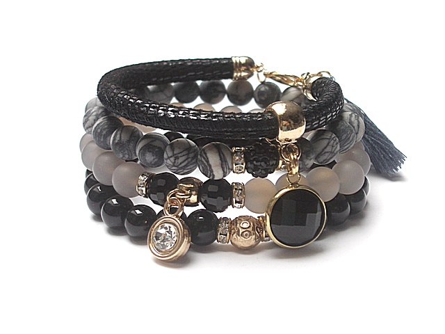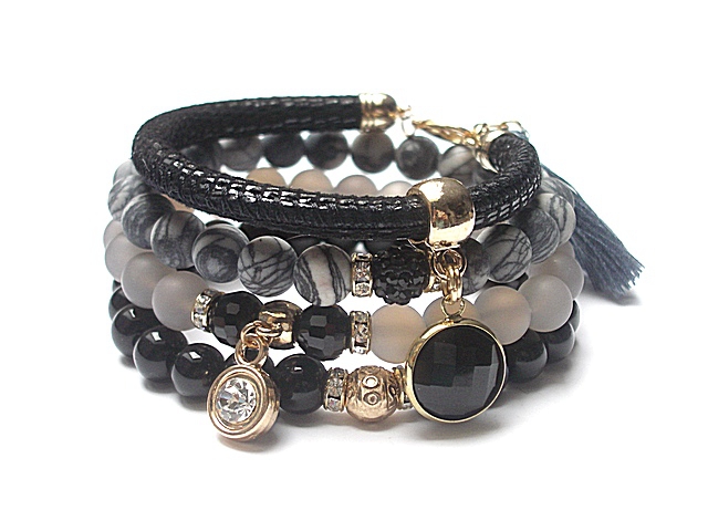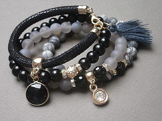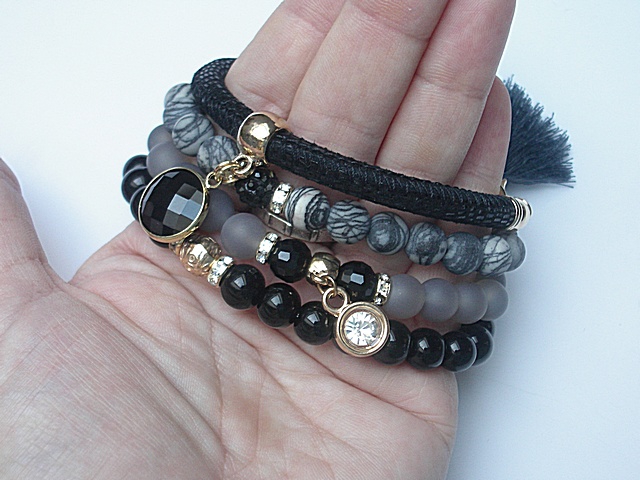 PROJEKT AUTORSKI. WŁASNOŚĆ KI-KA. KOPIOWANIE ZABRONIONE!!! Komplet czterech bransoletek wykonanych z naturalnych kamieni: agaty matowe [8mm], jaspis matowy [8mm], szklane kuleczki [8mm], kryształków fasetowanych [8mm], przekładki shamballa wysadzanej kryształkami Swarovskiego [8mm], rzemienia z naturalnej, miękkiej, koziej skóry [śr. 7mm], efektownej zawieszki ze szkła w okuciu, chwostu oraz elementów metalowych w kolorze tzw. różowego złota. Bransoletki pasują na nadgarstek 16-16,5cm. Biżuteria ozdobnie zapakowana.