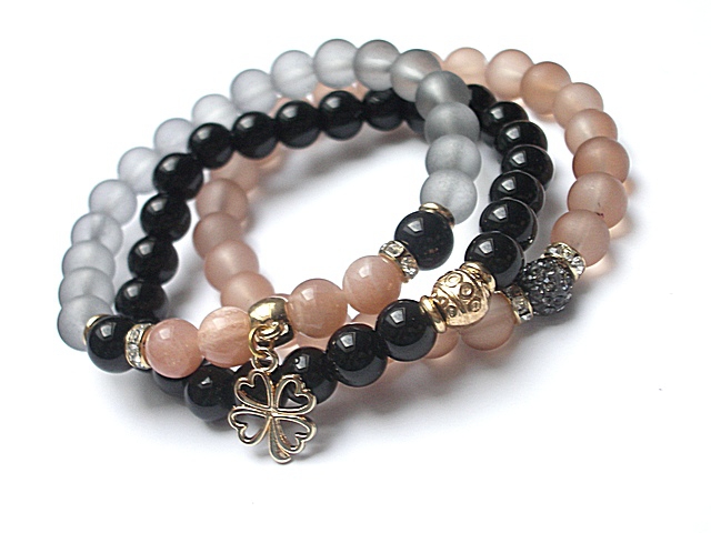Komplet trzech bransoletek wykonanych z naturalnych kamieni: kuleczki kamieni słonecznych [8mm], szklanych kuleczek [8mm], szklanych matowych kuleczek [8mm], kuleczki shamballa wysadzanej kryształkami Swarovskiego [8mm], przekładkami z cyrkoniami oraz elementów metalowych w kolorze złota. Bransoletki na gumce silikonowej. Pasują na nadgarstek 16-16,5cm. Biżuteria ozdobnie zapakowana. Możliwość dopasowania bransoletek do nadgarstka - wcześniej prosimy o kontakt.