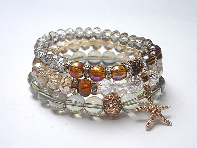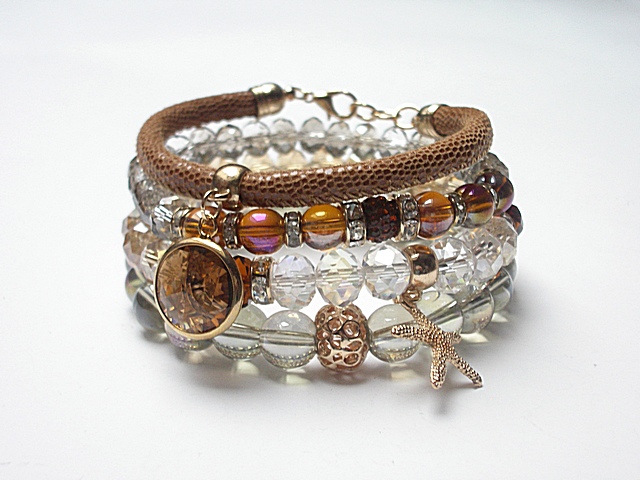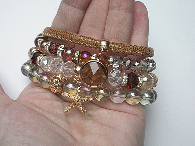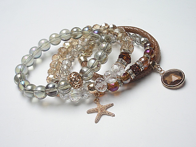 Komplet czterech bransoletek wykonany z kryształków fasetowanych [8 x 6mm i 8 x 10mm], szklanych opalizujących kuleczek [10mm], szklanych kuleczek [8mm], przekładki shamballa wysadzanej kryształkami Swarovskiego, zawieszki ze szkła w oprawie, rzemienia z naturalnej, cielęcej skórki [śr. 6mm] oraz elementów metalowych w kolorze złota. Bransoletki z kryształków i kamieni na gumce silikonowej. Pasują na nadgarstek 16-17cm. Biżuteria ozdobnie zapakowana