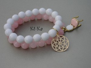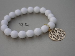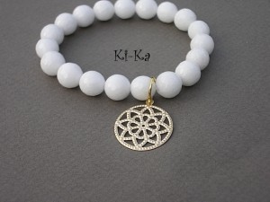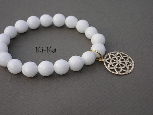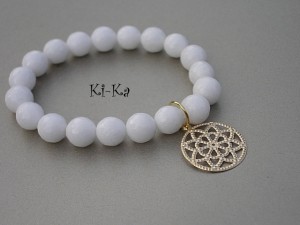 Bransoletka wykonana z naturalnych minerałów - fasetowane jadeity [10mm] oraz elementów w kolorze złota. Bransoletka na gumce silikonowej. Pasuje na nadgarstek 15-16,5cm. Biżuteria ozdobnie zapakowana. Bransoletka może stanowić komplet z innymi bransoletkami dostępnymi w naszej galerii - przykładowe zdjęcia. Zdjęcie pierwsze przedstawia przykładowy set. Cena dotyczy bransoletki w kolorze białym.