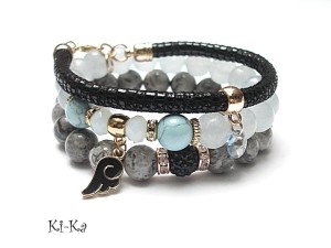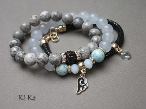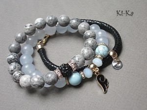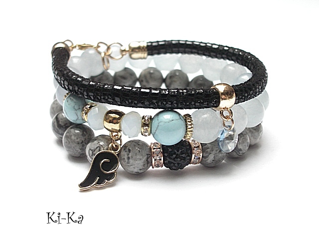 PROJEKT AUTORSKI. WŁASNOŚĆ KI-KA. KOPIOWANIE ZABRONIONE Komplet trzech bransoletek wykonanych z naturalnych kamieni: jaspisy [10mm], jadeity [10mm], howlity [10mm], kryształki fasetowane [8mm], kuleczki shamballa wysadzanej kryształkami Swarovskiego [10mm], zawieszki - kryształka Swarovskiego [8mm], rzemienia z naturalnej, miękkiej skórki [6mm] oraz elementów metalowych w kolorze tzw. różowego złota. Bransoletki pasują na nadgarstek 16-17cm. Biżuteria ozdobnie zapakowana