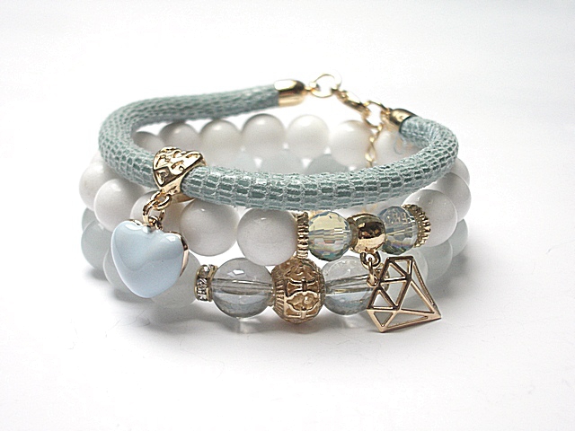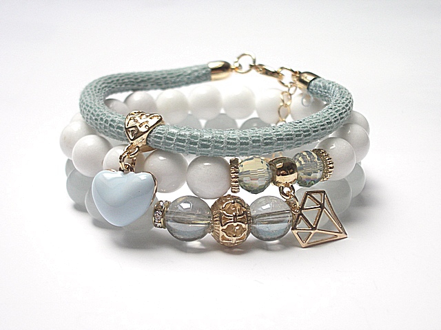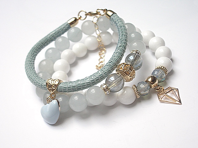 PROJEKT AUTORSKI. WŁASNOŚĆ KI-KA. KOPIOWANIE ZABRONIONE. Komplet trzech bransoletek wykonanych z naturalnych kamieni - jadeity [10mm], kwarc z powłoką aqua [10mm], kryształków fasetowanych [8mm], rzemienia z naturalnej skóry [śr. 5mm] oraz elementów metalowych w kolorze tzw. różowego złota. Bransoletki pasują na nadgarstek 16-17cm. Biżuteria ozdobnie zapakowana. Możliwość dopasowania do innego rozmiaru nadgarstka - wcześniej prosimy o kontakt.