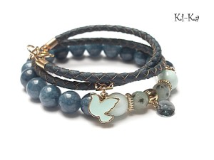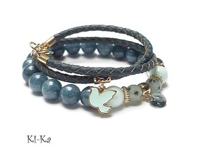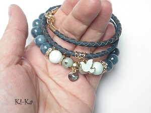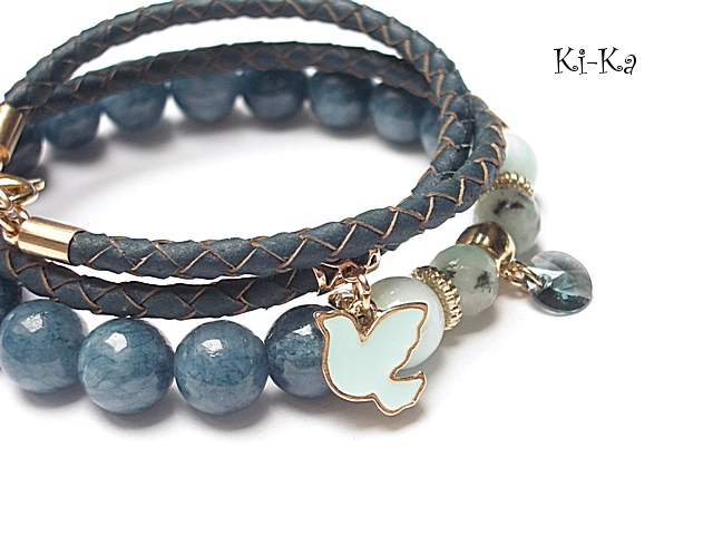 PROJEKT AUTORSKI. Własność KI-Ka. KOPIOWANIE ZABRONIONE. Komplet dwóch bransoletek wykonany z kamieni naturalnych - jadeity [10mm], fasetowane kuleczki jaspisów [8mm], rzemienia z naturalnej skóry, zawieszki kryształka Swarovskeigo oraz elementów metalowych w kolorze tzw. różowego złota. Pasują na nadgarstek 16-17cm. Biżuteria ozdobnie zapakowana